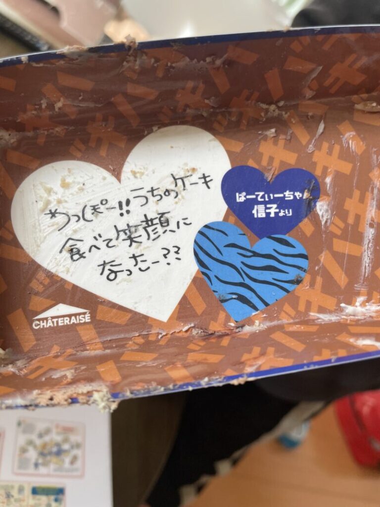 ケーキの底板には、信子さんからのメッセージが💕︎