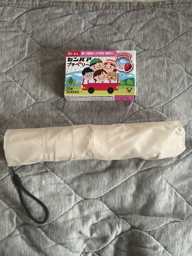 外側のポケットに晴雨兼用の傘(ダイソーの系列店で購入)770円