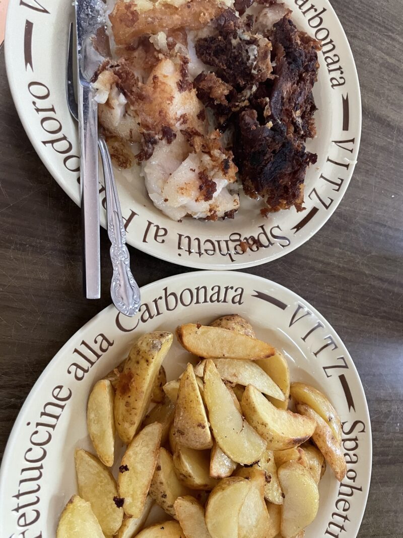 家でフィッシュアンドチップスを作ってみましたら、油に入れて少ししたら衣が剥がれる剥がれる…