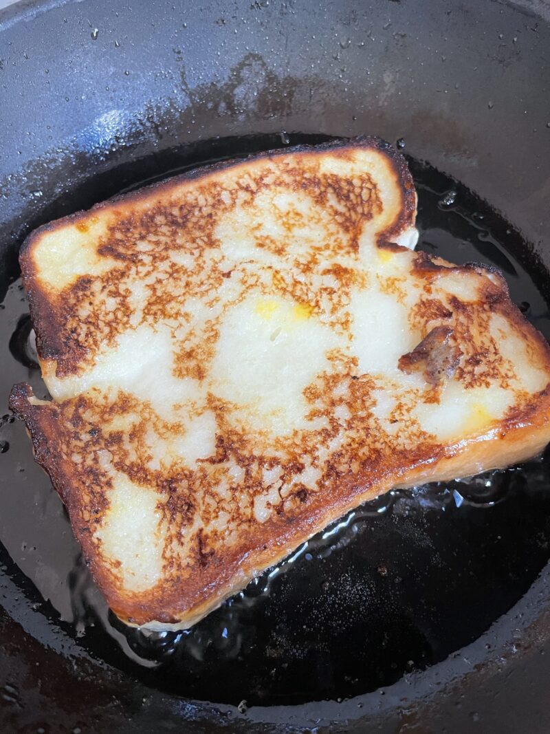 4.油を引いたフライパンでパンを両面焼く(砂糖多めに入っているのでパンが大変焦げやすくなっています)
